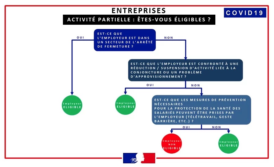 Pour ce qui concerne l’activité partielle, les dossiers seront acceptés sans difficulté pour les entreprises faisant partie de la liste des entreprises contraintes à fermer (établissements recevant du public non indispensables à la vie de la Nation). Pour les autres entreprises, il s’agira d’une étude au cas par cas. Le gouvernement souhaite la poursuite de l’économie et effectivement, les entreprises n’entrant pas dans la liste de l’arrêté de fermeture doivent mettre en œuvre les mesures permettant la poursuite d’activité.